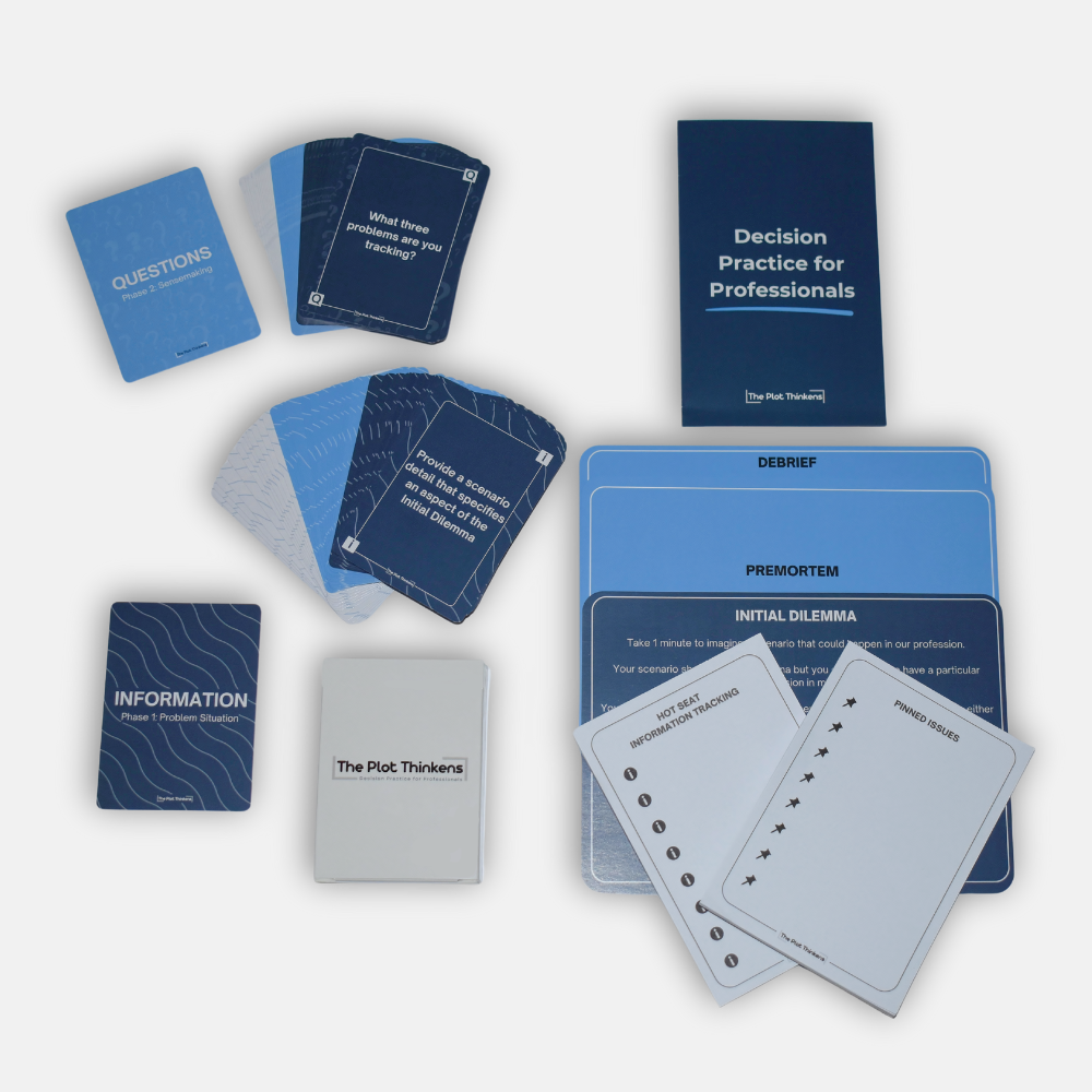 Place the Questions deck face down in front of the GameMaster, and keep the Gameflow, PreMortem, Pinned Issues, and Debrief cards close by.